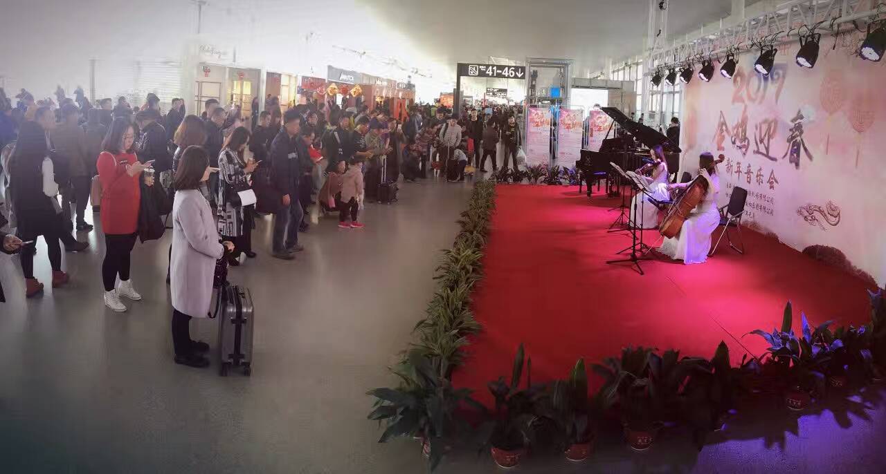 1月22日上午10時(shí),隨著一陣歡快的小提琴聲響起,精品曲目《藍(lán)色多瑙河》的曲調(diào)頓時(shí)飄揚(yáng)在祿口國際機(jī)場候機(jī)樓內(nèi)。愛濤交響樂團(tuán)的藝術(shù)家們手中的大提琴、小提琴緩緩流淌出歡快的旋律,《土耳其進(jìn)行曲》、《花好月圓》、《春節(jié)序曲》等優(yōu)美的樂曲經(jīng)過弦樂重奏的演繹,散發(fā)出別樣的韻味,乘客們紛紛駐足聆聽,享受音樂之美。